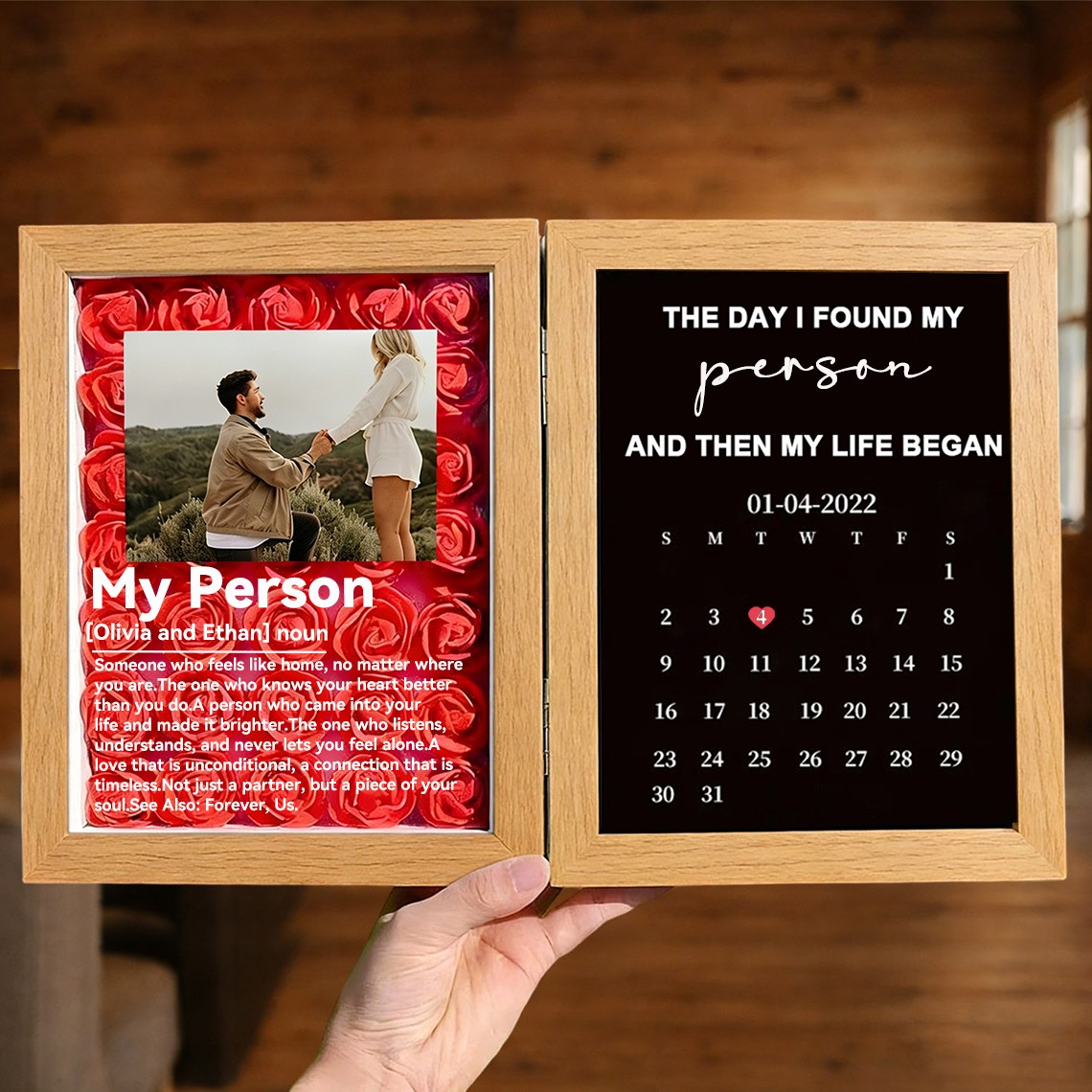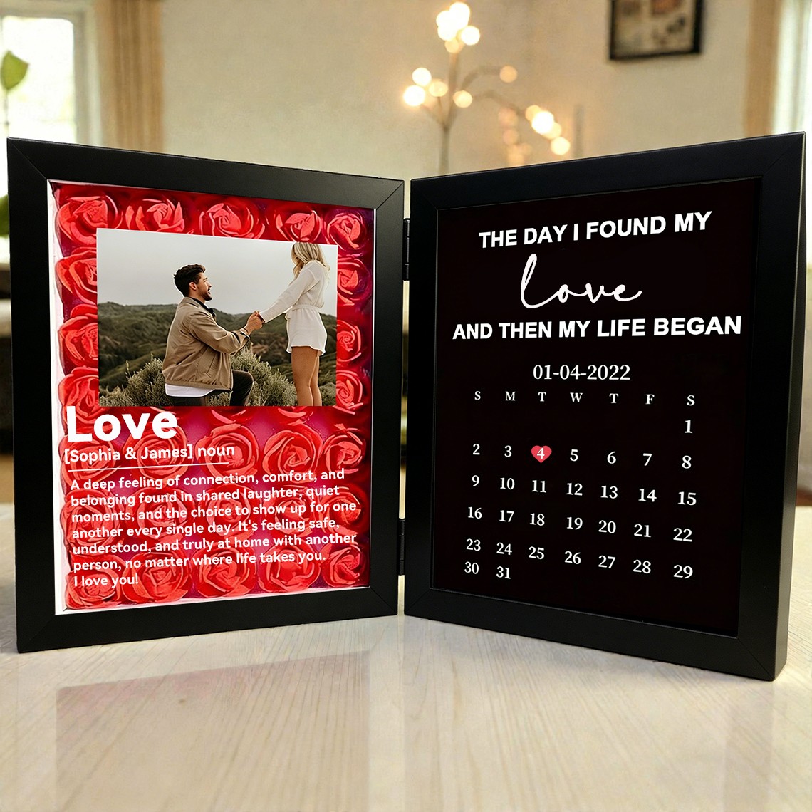 This handcrafted double folding frame is the ultimate keepsake for celebrating love. It features a unique 2-in-1 design: the left side displays a 3D handmade rose heart with a modern music player interface, while the right side showcases your personal photos paired with a romantic "Dictionary Definition".