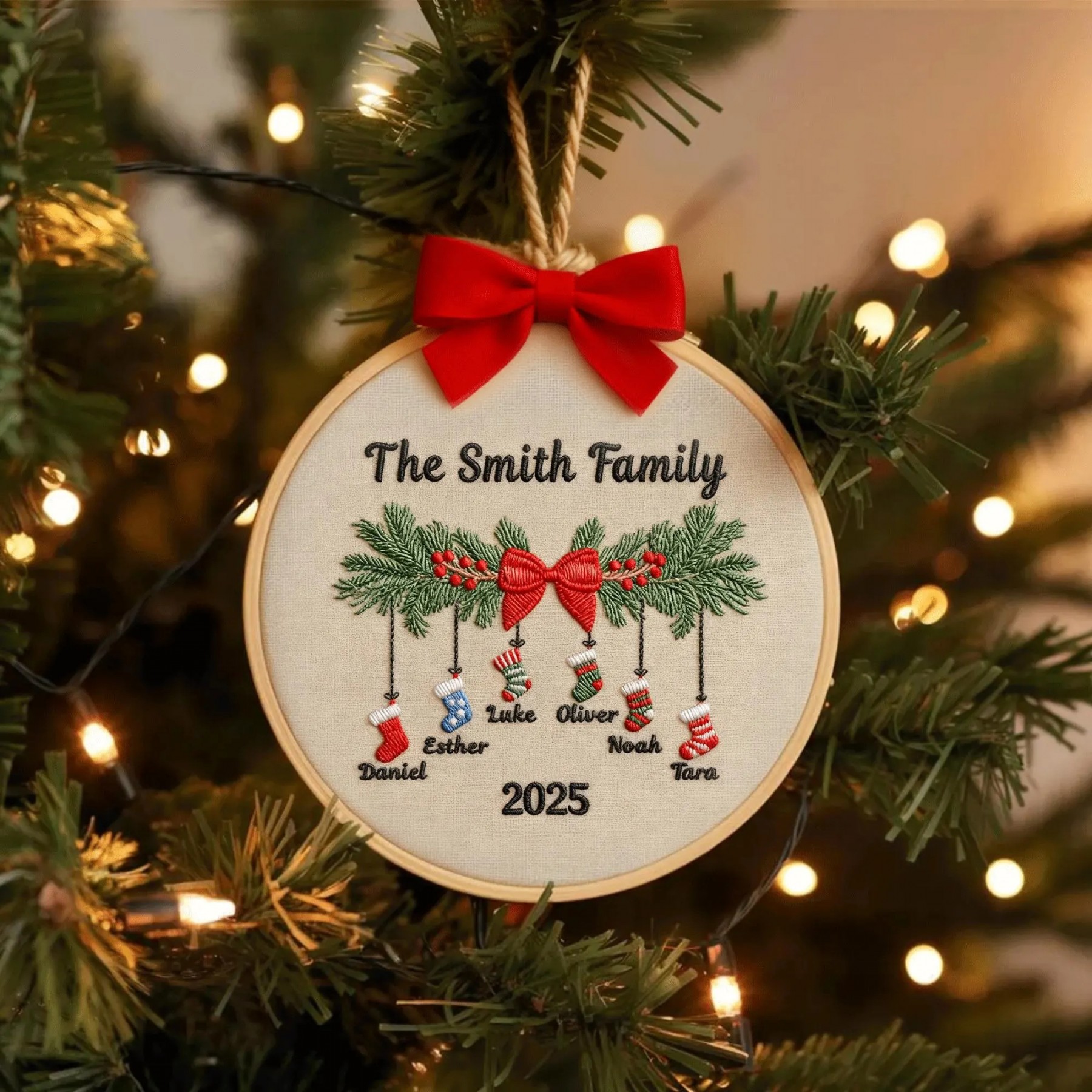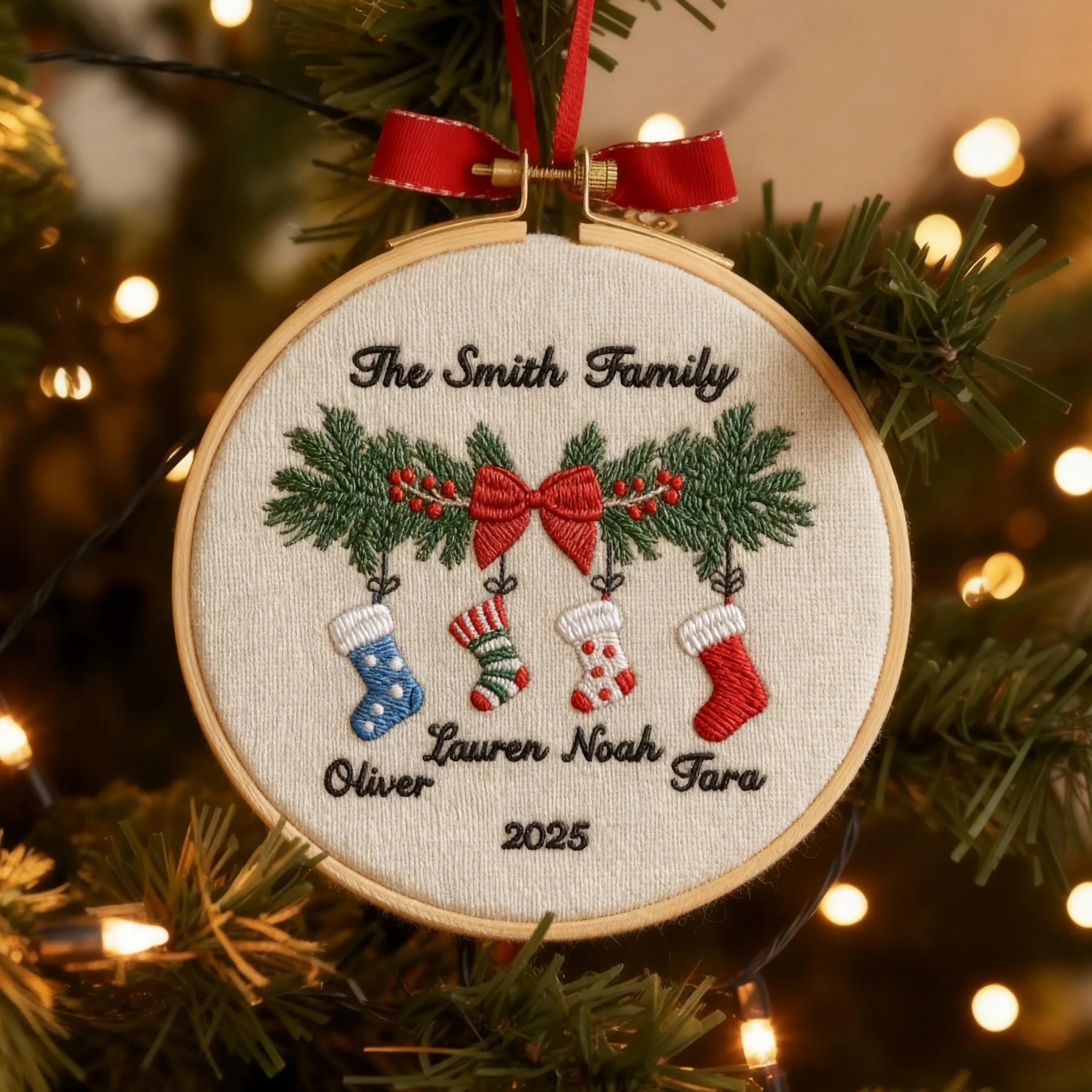 This personalized embroidery hoop ornament features a festive pine garland with hanging stockings — each embroidered with your family members’ names. A timeless decoration to treasure year after year, perfect as a family gift or festive wall display.
