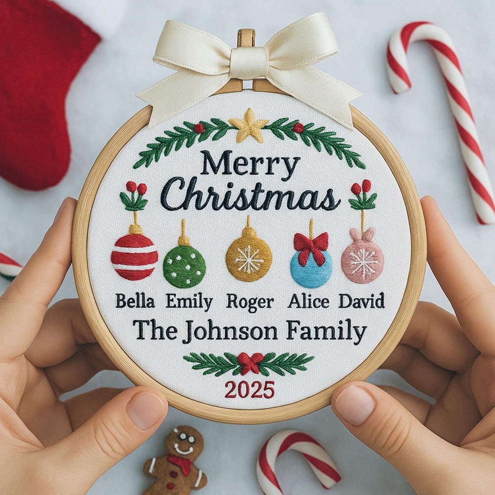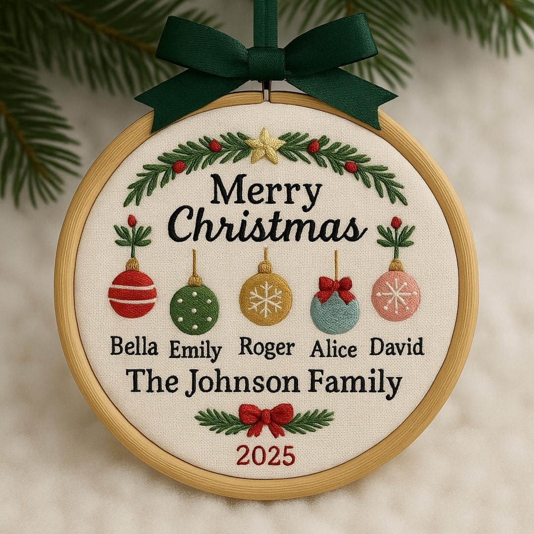 This personalized embroidery hoop ornament features a festive pine garland with hanging stockings — each embroidered with your family members’ names. A timeless decoration to treasure year after year, perfect as a family gift or festive wall display.